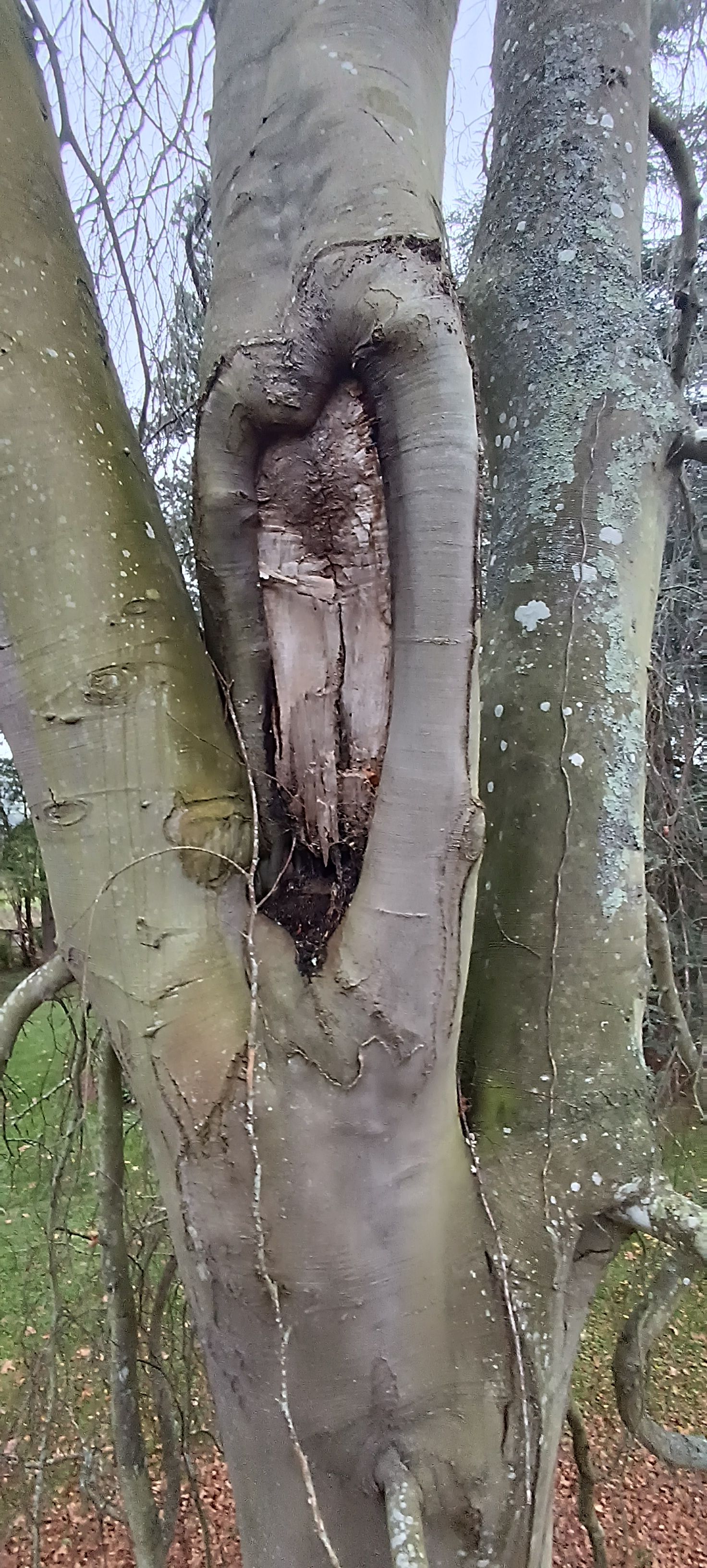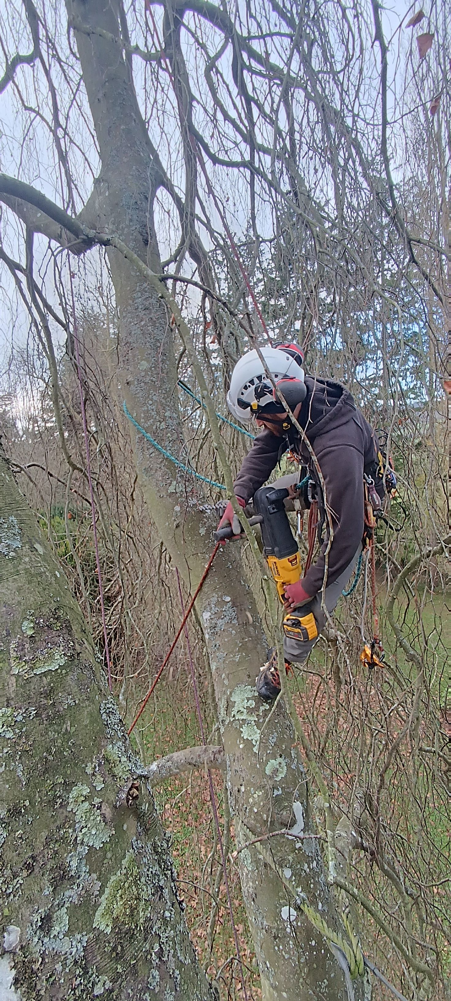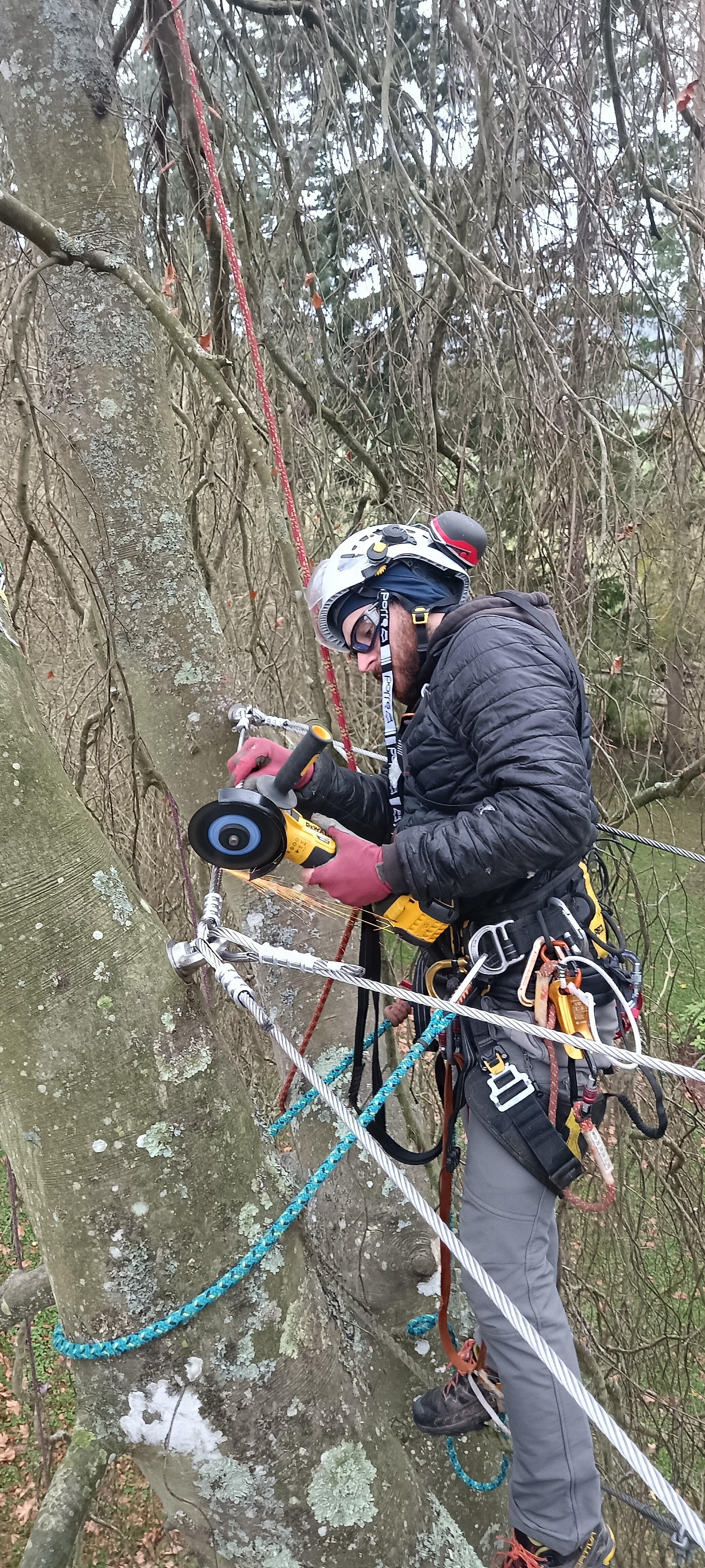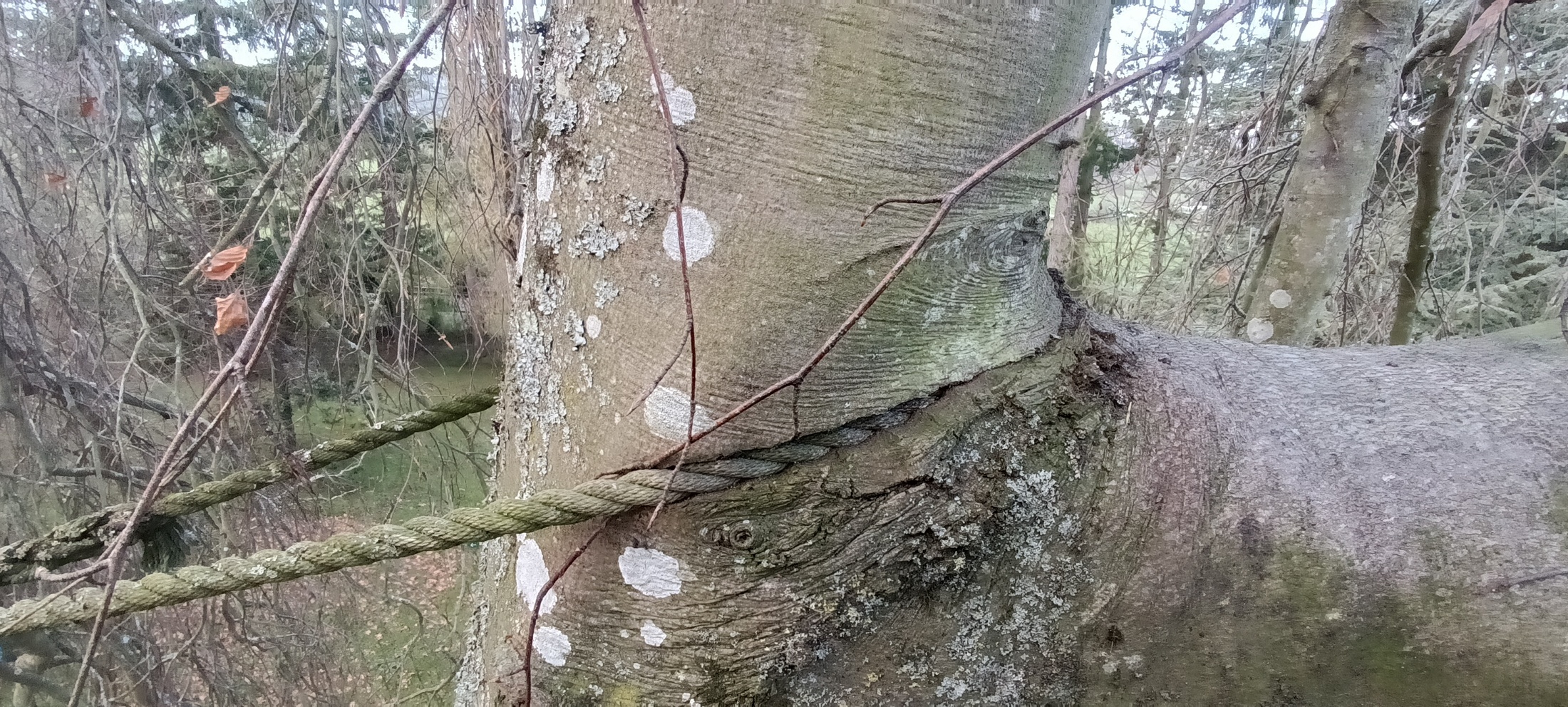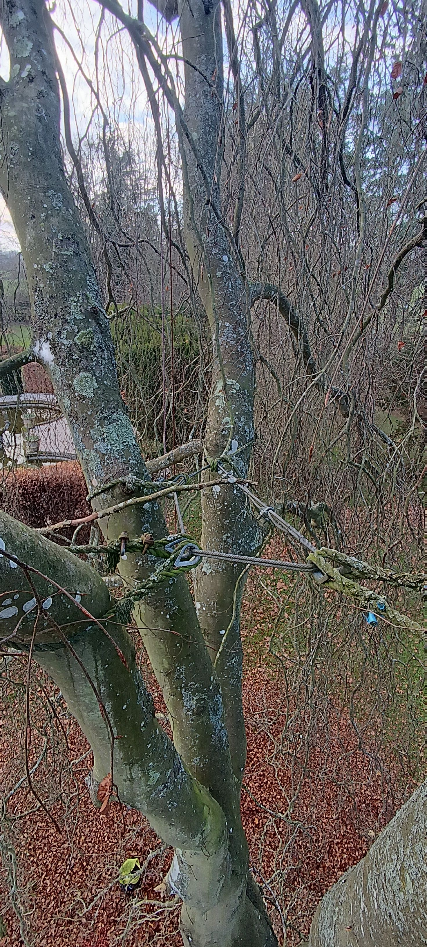 Sur ce chantier, notre équipe est intervenue sur un magnifique hêtre pleureur centenaire (Fagus sylvatica ‘Pendula’). Cet arbre remarquable présentait une fourche à inclusion, c’est-à-dire une zone de faiblesse où deux charpentières se rejoignent en formant un angle fermé. Ce type de structure peut engendrer des contraintes mécaniques importantes et augmenter le risque de rupture au fil du temps.Il y a plus de vingt ans, un premier système de haubanage avait été installé, mais avec des matériaux non adaptés aux normes actuelles.