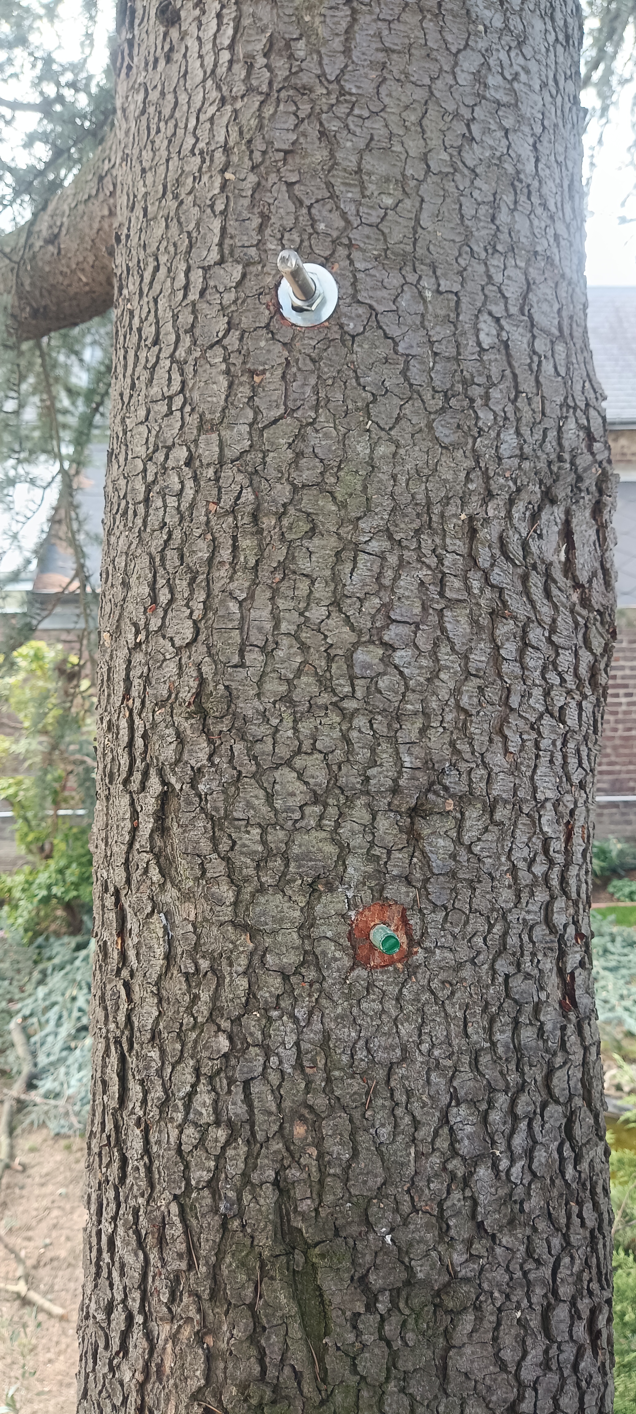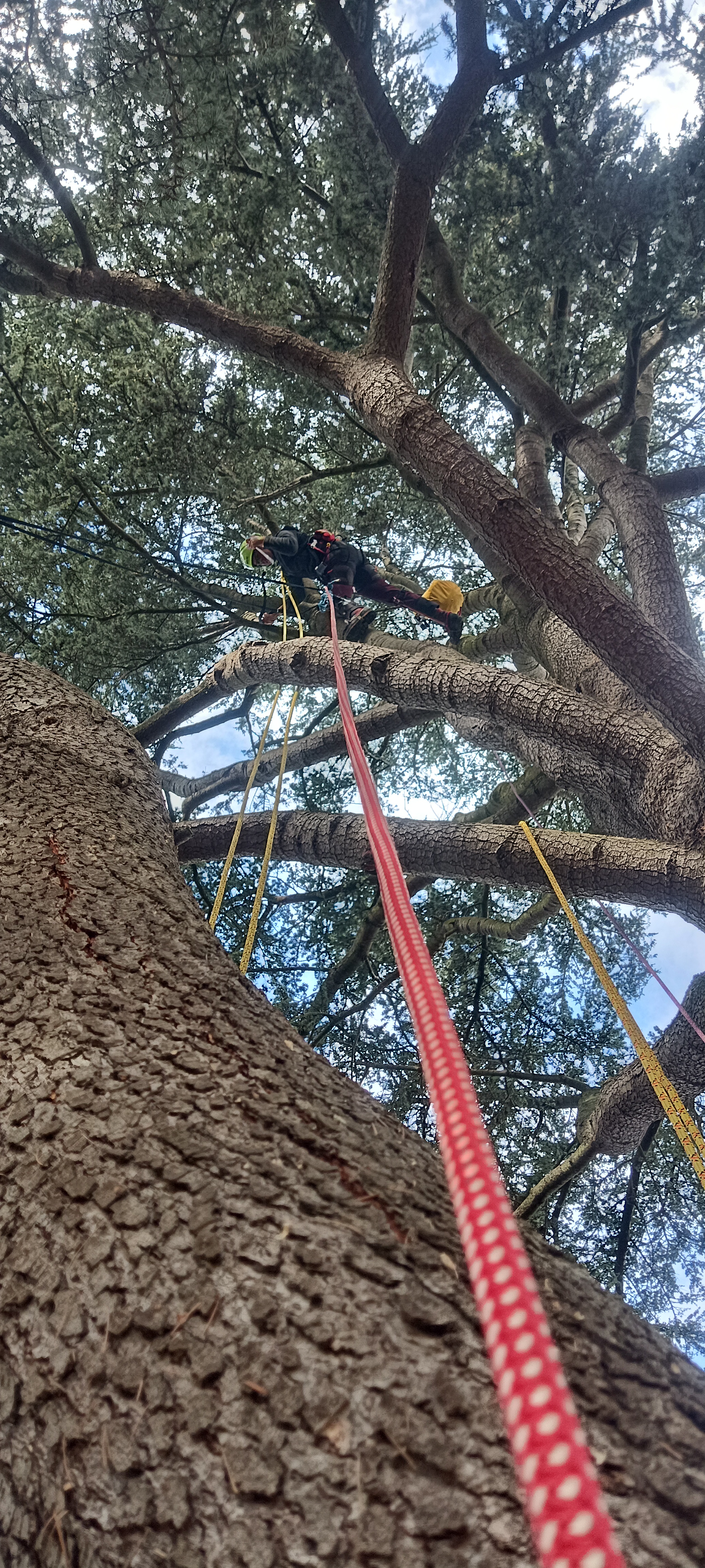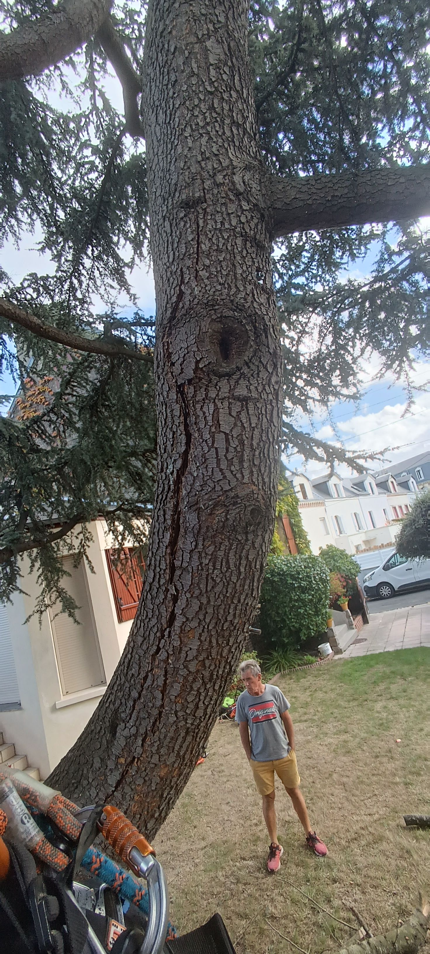 Cette semaine, nous sommes intervenus sur un magnifique cèdre de l’Atlas, installé dans un petit jardin en plein centre du Havre. Le client nous avait contactés après avoir remarqué une fissure sur l’une des charpentières principales.Avec ma collègue de l’entreprise L’Arbre Nomade, nous avons réalisé une consolidation mécanique : perçage de la zone fragilisée, pose de broches en tige filetée, verrouillées par des rondelles et écrous, afin d’assurer la cohésion du bois.Nous avons ensuite installé un système de haubanage passif en corde textile afin de sécuriser d’éventuelles ruptures de branches dans le houppier. Cette intervention préventive vise à protéger les biens situés à proximité de l’arbre — maison, véranda et autres plantations — tout en préservant la stabilité et la sécurité de ce beau cèdre.Une belle collaboration entre passionnés de l’arbre Préserver, sécuriser et prolonger la vie de ces géants : notre métier au quotidien !